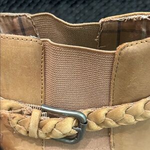 Chic tan ankle boots with a stylish braided strap. Perfect for versatile wear.