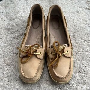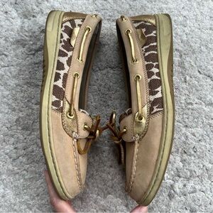 Sperry: Tan Suede, Textle Giraffe Print Metallic Gold Leather Boat Shoes Size 9M