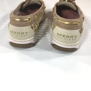 Sperry Top-Sider Angelfish 'Cane Linen' boat shoes. Tan/beight leather upper with woven metallic gold side panels, and a tie on top. Style 9432212.