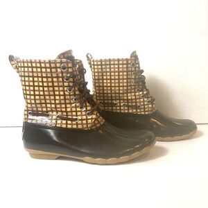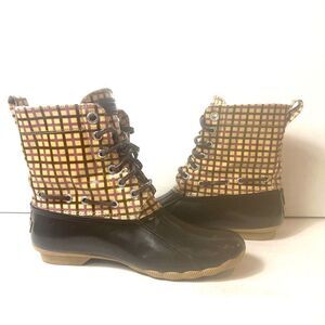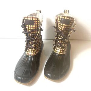 Sperry Top Sider Duck Mid Rain Boots Women's 9 Brown Saltwater Plaid Rubber Lace