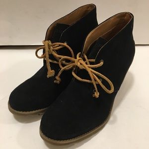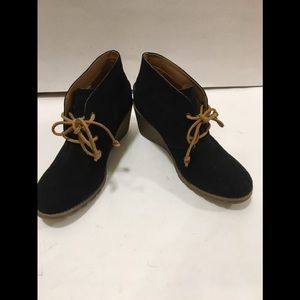 Sperry Top Sider Harlow Black Suede Wedge Booties worn once, no box, Such versatile chic black suede booties! Black textured suede, 3” rubber textured wedge heel, brown sole stripe detail, “Sperry” logo on the side, no trades