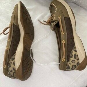 Sperry Top Sider Leather Tan Brown Boat Shoe with Animal Print Accent Size 8.5M