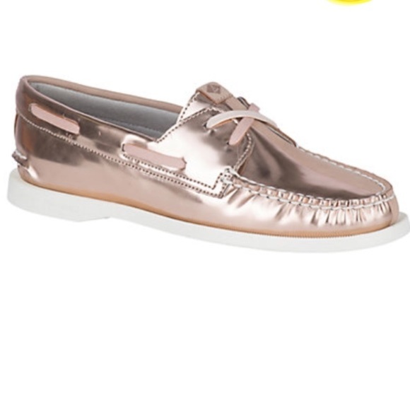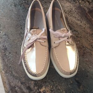 This is a pair of Sperry authentic original star leather boat shoes in a two tone metallic gold and tan color. Ortholite insole, rubber outsole. Brand new. Price firm. Thanks for looking.