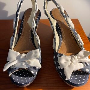 Sperry Top Sider Adorable Navy Blue With White Polka Dots Wedge Shoes With White Bow Design- NWT