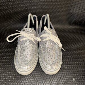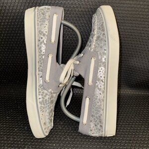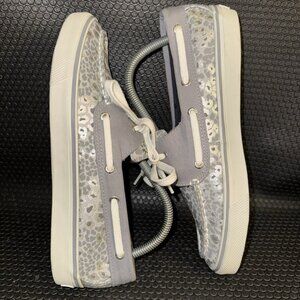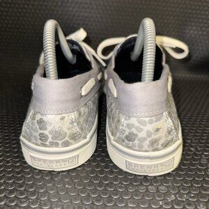 Sperry Top Sider White Gray Silver Leopard Canvas Lace Up Boat Shoes Size 9M