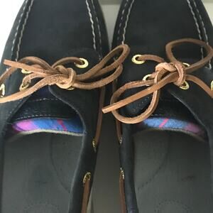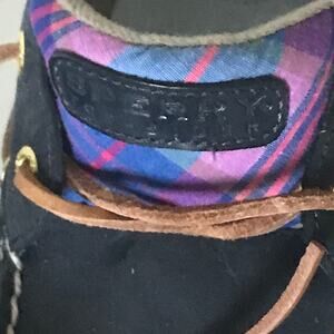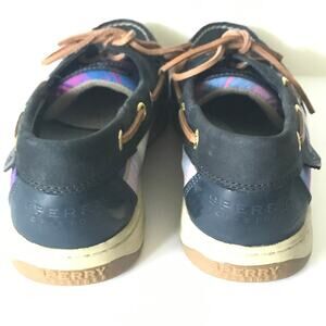 Very nice excellent condition women's Sperry top sider boat shoes. Little to no wear. Features leather and fabric upper. Navy blue with colorful madras plaid. Leather ties. Size 8.5 medium. Very little wear.