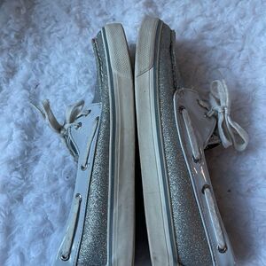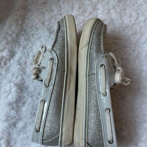Sperry Top Sider silver glitter boat shoes size 8M pre owned in good used condition no tear normal wear signs of wear on the outer soles see all pictures any questions please message