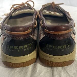 Sperry Top Slider Size 9 Brown leather and plaid cloth tie women shoe
