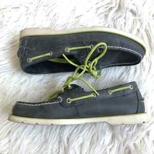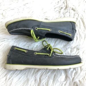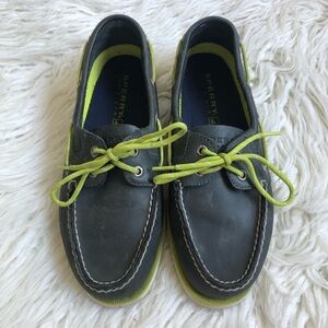 Awesome leather Sperry Top-Sider boat shoes with neon laces. Dark gray color. Minor scuffing but in overall good used condition.*m