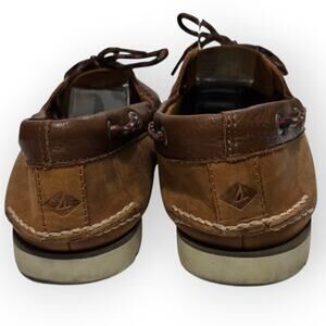 Classic Sperry Top-Sider “Authentic Original” boat shoes in premium tan leather with brown trim and rawhide laces. These shoes offer a timeless nautical style built for comfort and traction, whether you're on or off the water. You'll love the quality and classic style of these Sperry boat shoes!