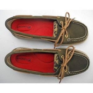 Sperry Top-Sider boat shoes women's size 6 M. Brown nubuck leather and mesh upper with tan lacing that ties in front. Padded tongue has camouflage and leather patch embossed with Sperry Top Sider. Camouflage heel counter and rubber Sperry heel. Red cushioned insoles are clean. Man made sole shows minimal wear.