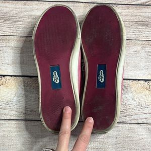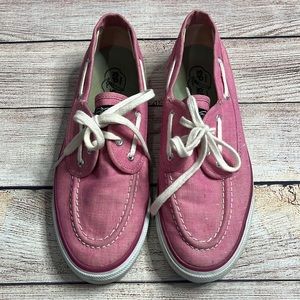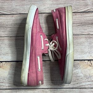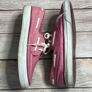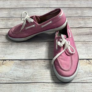 Sperry Top-Sider Seamate Boat Shoe in Raspberry Chambray. Good used condition. These show wear n the outsoles- the white has discoloration. Uppers are in better condition. Lace up shoes. Style 9298694