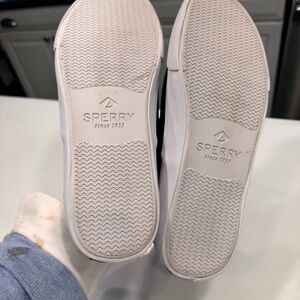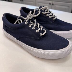 NEW without box. Men’s Sperry Topsiders navy blue canvas sneakers. Navy blue canvas uppers white rubber soles, leather shoe laces. Mens size 7.5