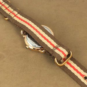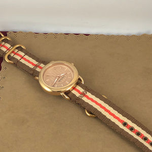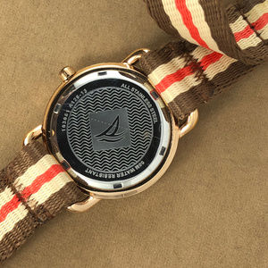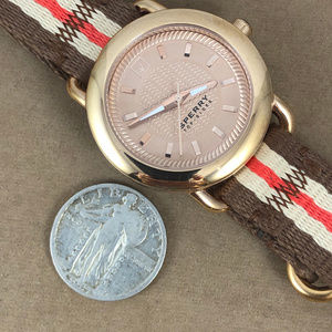 Sperry Top-Sider Women's 103061 A126-13 Sandbar Stainless Steel Watch. The 9 Inch Strap is Brown, Tan Orange Stripe Nylon Materiel with a Rose Gold 1.5 inch case eye clean Mineral Crystal with no scratches and case has a few scuffs has a Japanese Movement Nicely Pre Owned New Battery and Serviced