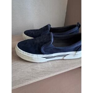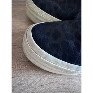 Elevate your casual style with these Sperry Top-Sider women’s slip-on sneakers in a navy blue leopard print design. These shoes feature a suede-like upper, vulcanized white rubber soles, and classic slip-on styling for easy wear. Marked as size US 7, model STS86738, made in Vietnam. The outsoles show normal signs of wear but have plenty of tread left. Uppers are in good pre-owned condition with no major flaws, just minor signs of use. Great for everyday wear, running errands, or adding a touch of fun to your wardrobe.