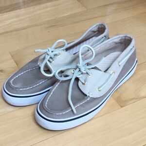 Sperry Top-Sider boat shoes. Khaki and tan. Women’s size 6.5