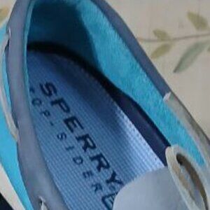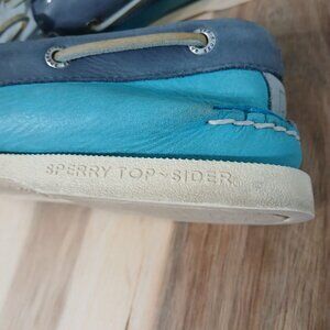 Description: Classic men’s Sperry Top-Sider boat shoes in a bold two-tone design — gray and aqua blue leather upper with light blue gingham insole lining. Genuine leather with traditional 360° lacing system and non-marking rubber outsoles for great grip on deck or everyday wear. Timeless nautical style with a modern pop of color. Men’s size 11.5 M. Gently worn, very good condition. From a clean, smoke-free, pet-free home.