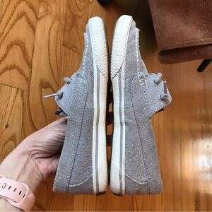Sperry Top Sider Lounge away Jr boat shoes in silver sparkle. Glitter is always hard to photograph but they are sparkly :). Youth girls size 2. They are in good used condition with minimal wear to soles or insoles. There are some light pink stains and markings on the white rubber — nothing that is noticeable from a distance, but you can see it close up.