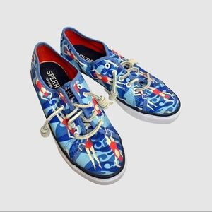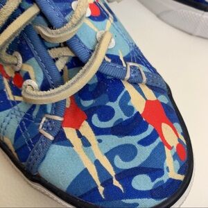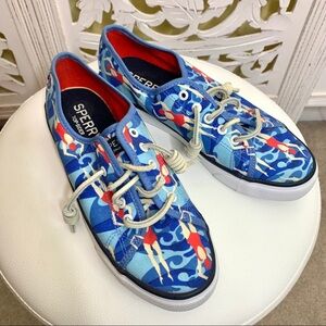 Sperry Topsider Seacoast Sneakers in excellent preowned condition, no flaws. So cute with swimming ladies printed on canvas. Leather laces. Comfy footbed.