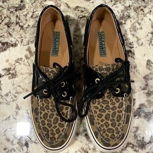 Sperry Topsiders Women's Leopard Canvas Black Patent Leather Boat Shoes size 7!