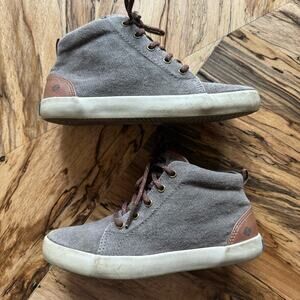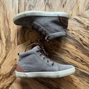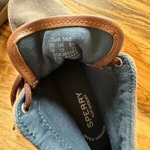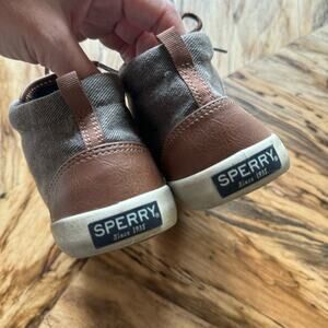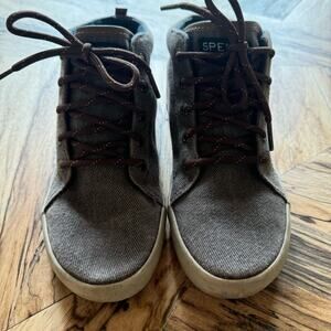 Size 1M Kids Sperry Tuck Mid Canvas Sneakers in Taupe Brown Leather. Lace up. High Top. Adorable on. VGUC, only worn a handful of times.