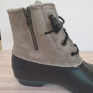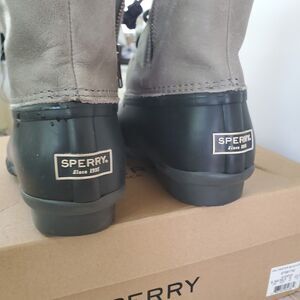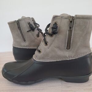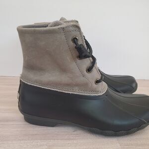 Sperry Duck Boots Women 8.5 M Grey Black. Waterproof Slip In Barrel Tied Lacing. Very Good pre-owned condition.