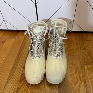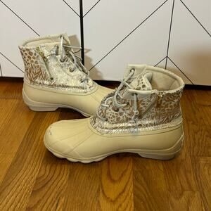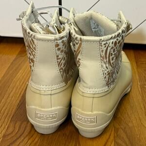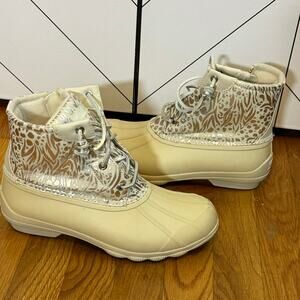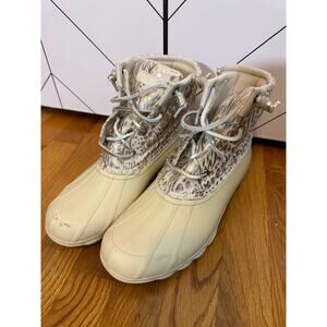 Sperry Women’s 8 Round Toe Syren Gulf Metallic Jacquard Duck Boot Rain Booties. Boots are in worn condition, with no structural issues.