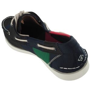 Step Into Comfort and Style with These Sperry Boat Shoes. The Almond Toe and Slip-on Design Make Them Easy to Wear, While the Laces Provide a Secure Fit. The Navy Canvas Upper Is Accented with Pink and Green Colorblock, Adding a Playful Touch to Any Outfit.