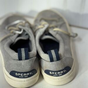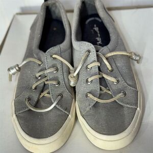 Keywords: Sperry, Crest Vibe, slip-on shoes, women's footwear, gray linen, casual style, cushioned insole, durable rubber outsole, comfortable shoes, pre-owned, easy slip-on, versatile shoes, weekend wear, casual occasions, women's slip-ons.