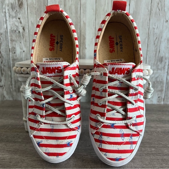 These Sperry shoes feature a fun Jaws theme with vibrant red stripes. Perfect for adding a splash of color to any outfit.