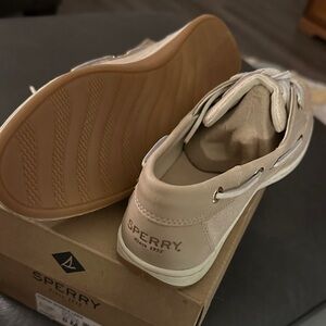 Elegant Koifish Sparkle linen and leather loafers by Sperry. Ideal for everyday wear. Classic design with lace-up detail. Brand new in the box. Discontinued. 8M