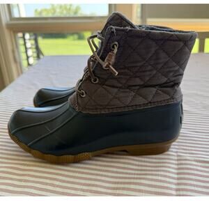 Sperry, Saltwater Duck Boots, women's rain boots, waterproof, quilted fabric, casual fall boots, lace-up, non-marking outsole, brown boots, round toe, medium width, pre-owned.