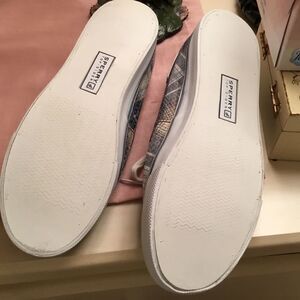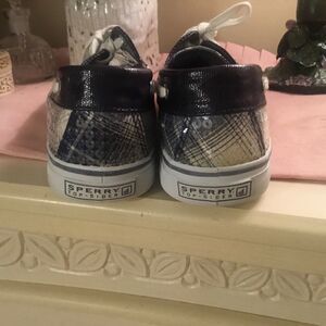 Sperry brand Women’s shoes in size 7.5 Medium width. Cute navy blue, light blue and white check all covered with clear sequins to give the shine. Navy trim, white shoelaces in the traditional top sider loafer style. White rubber soles for gripping.