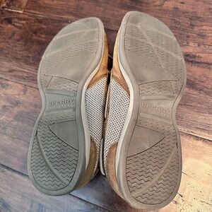 Stylish Sperry boat shoes in tan and brown. Ideal for casual wear. Comfortable and durable design. Size 7 Good condition