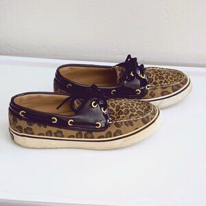 Sperry Women's Leopard Canvas Topsiders Boat Shoes with Black Patent Leather Trim