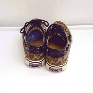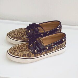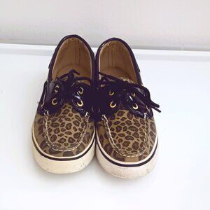Sperry Women's Topsiders Boat Shoes 6 Leopard Canvas Black Patent Leather Trim