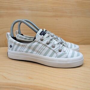 This is a pair of Sperry Women's Crest Vibe Boat Shoes Sneaker Grey Stripe Size 5 Lightweight in used condition as pictured. Please review all images for an accurate representation of the item. We always carefully package and ship out immediately. If you have any questions, please let us know.