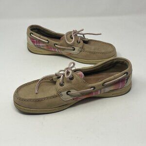 Sperry boat shoes, women's size 9. Tan leather uppers with pink plaid accents on the tongue and sides. Gently worn, in good used condition. Some marks/signs of wear on uppers, insoles, and soles. See pictures.