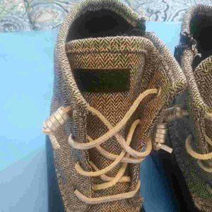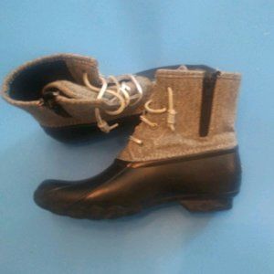 Sperry rain shoes - black bottom with gray/black herringbone pattern around ankle. Size 6 women/girls. Zips at ankle on side and has drawstring also. Soles, heels, insole all in great shape.