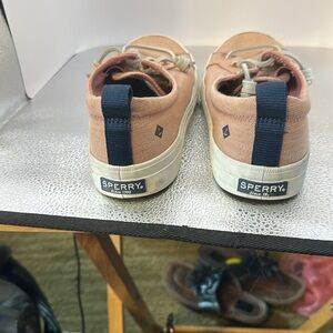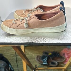 Sperry size 8 beautiful pair of shoes lightly used and some you can see some wear but not much. They are a light pink and the shoelaces are leather off-white.