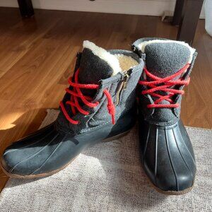 Charcoal wool blend upper with 100% genuine sheepskin lining and fun contrast red laces. Always stored in box and in excellent used condition. Clean and ready for your next cold weather adventure.