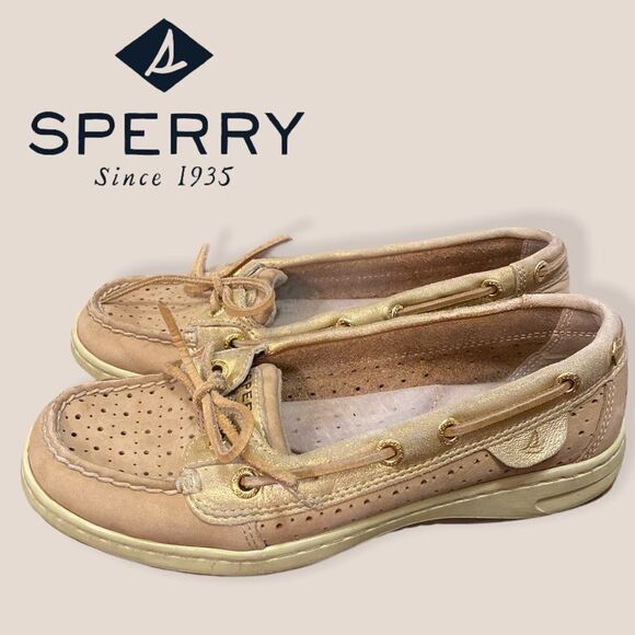Cute! pair of Sperry Top-Sider women's Angelfish, leather, perforated stripe boat shoes.
