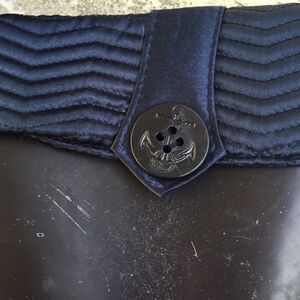Great boots with a satin like trim, body is kind of tie dye ish. Soles are very good n heel has a little bit of wear. Wedge style. Navy Blue with purple color