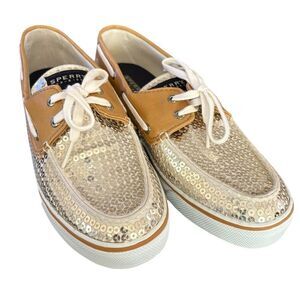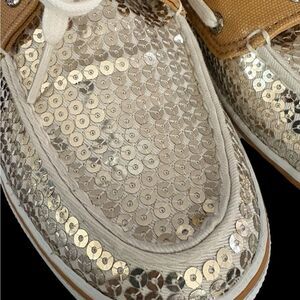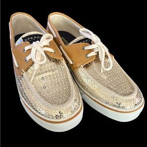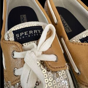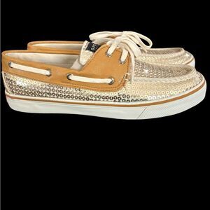 Shine with Sperry's sequin boat shoes. Gold and tan design. Ideal for casual elegance.