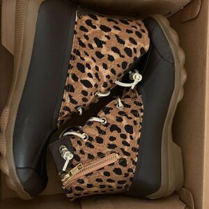 Mid height cheetah print boot with zipper entry, textured round duck toe and micro-fleece lining.