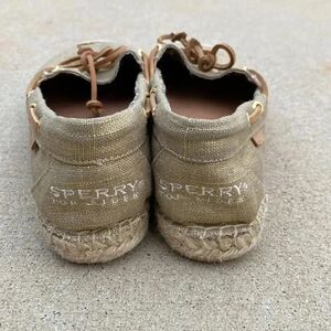 Women’s Sperry Topsider Gold Fabric Shoes. Please see photos for indications of use.
