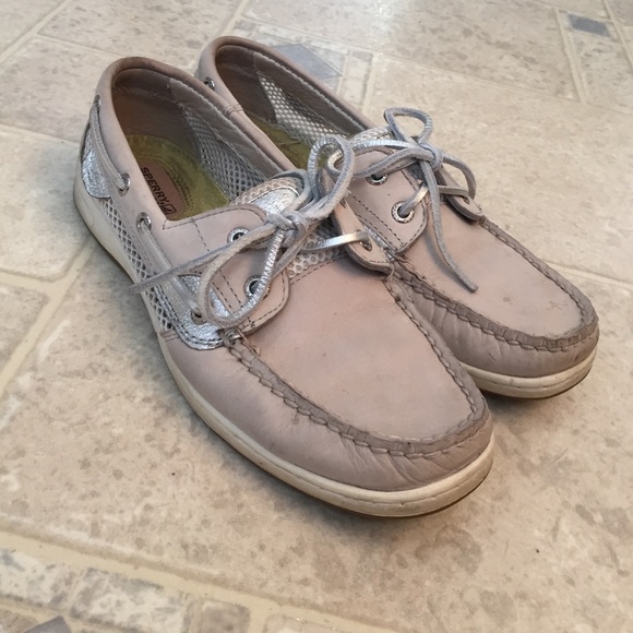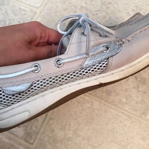 Sperry Top sider slip on shoes! Good condition!! Silver and cream! Extremely comfortable! I don't wear these as much anymore and they deserve a good home!
