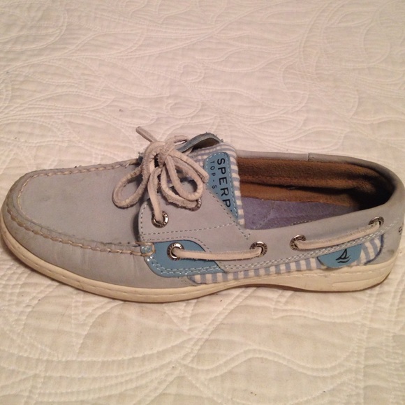 Womens light blue Sperrys, size 7. Used, in okay condition, one noticable stain shown in the photos. Give me a reasonable offer!
