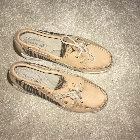 Brown zebra print sperry’s.. like brand new!! Only worn a few times. Very minor scratches on top of right shoe but hardly noticeable.