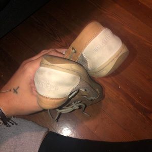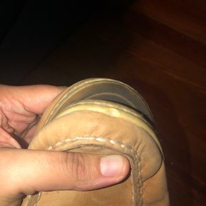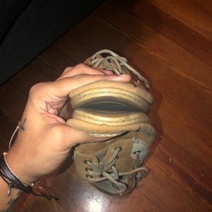 These are a bit better. Worn but not near as much as the blue/gray ones. These is a weird little mark on the right shoe like the leather got scratched? But theyre in good condition other than they look worn in. (sorry about my hair I will pick it off before sending lol) oh the right shoe also has a little nick at the tip of the shoe, it was like that when I bought them, no clue why its like that, I got them off line at journeys and didnt feel like returning them because of it lol